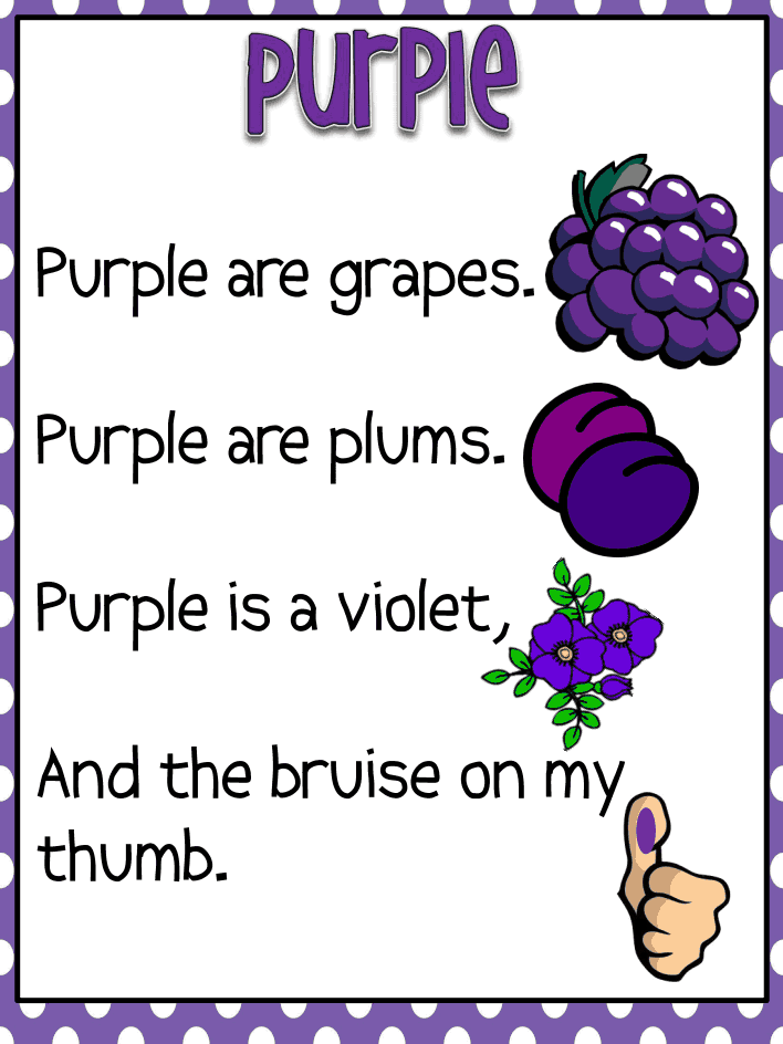 These poems are for children from 2 to 3 years. In order to show them the colors in an entertaining and easy way. Relating the color with different objects.